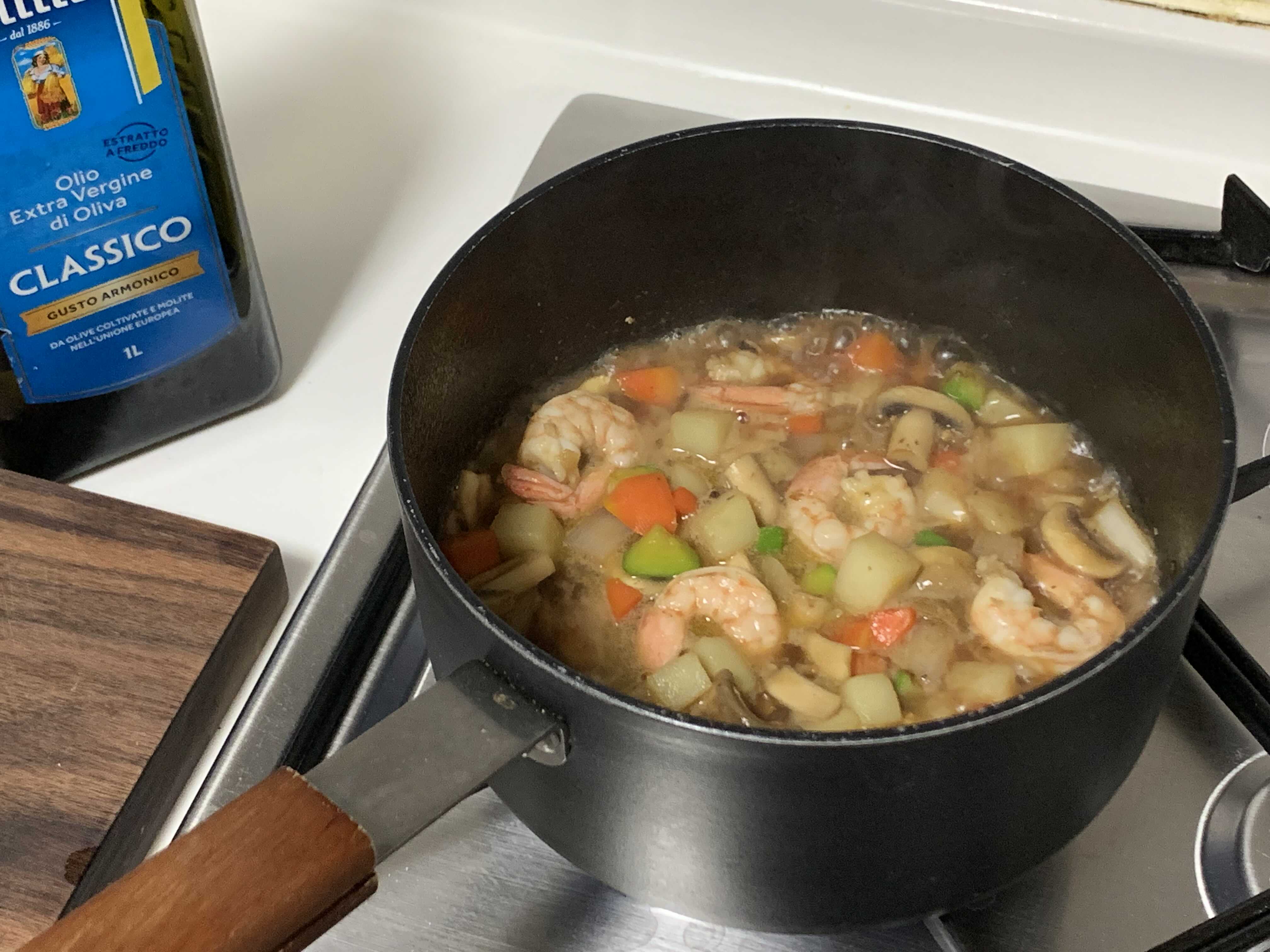 양파 1/2개, 애호박 1/4개, 당근 1/3개, 양송이버섯 남아있던 몇 알, 감자 작은 사이즈 1개, 깐새우 5마리 정도