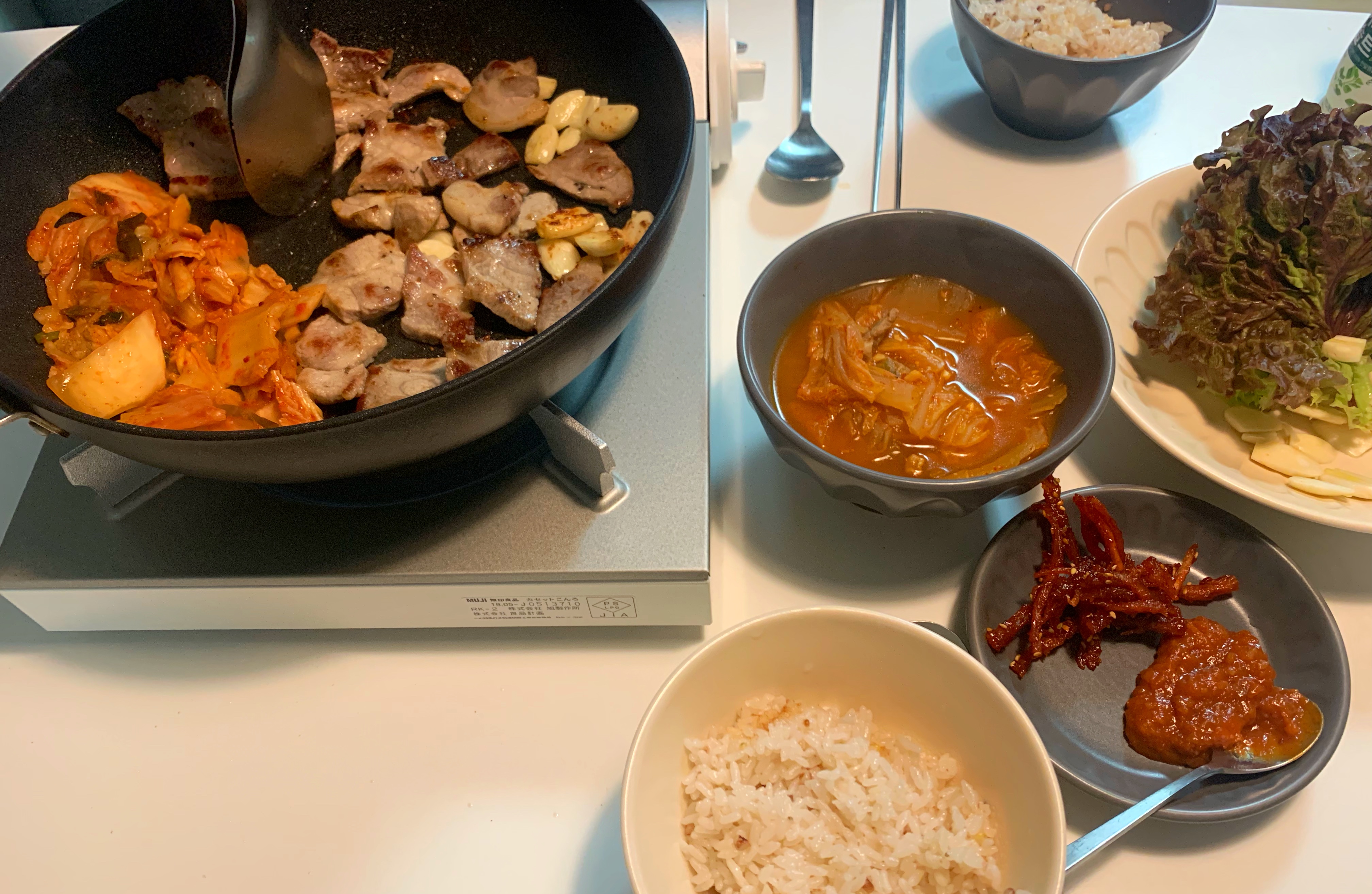 김치찌개 끓이고, 돼지 목살 굽굽...